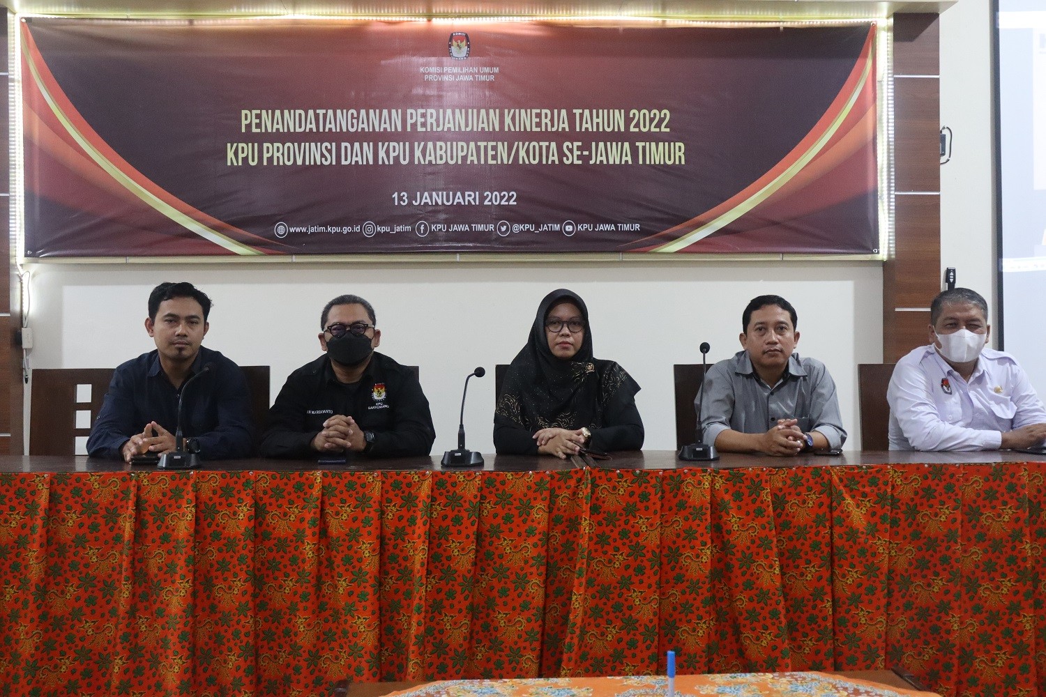 Banyuwangi - KPU Kabupaten Banyuwangi hari ini (13/01) hadir bersama KPU Kab/Kota Se-Jawa Timur dalam Penandatanganan Perjanjian Kinerja Tahun 2022 yang diselenggarakan secara daring oleh KPU Provinsi Jawa Timur.