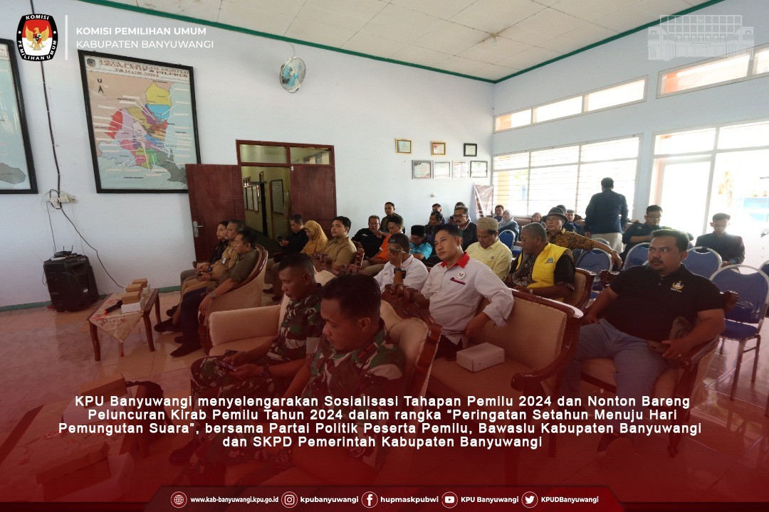 Banyuwangi, kab-banyuwangi.kpu.go.id – Komisi Pemilihan Umum (KPU) Kabupaten Banyuwangi, Selasa (14/2), melakukan sosialisasi tahapan Pemilihan Umum (Pemilu) 2024 disertai nonton bareng Peluncuran Kirab Pemilu dalam rangka Peringatan “Setahun Jelang Pemilu 2024”, bersama pengurus partai politik tingkat Kabupaten Banyuwangi, Badan Pengawas Pemilihan Umum (Bawaslu) Kabupaten Banyuwangi, Forum Komunikasi Pimpinan Daerah (Forkopimda) dan Satuan Kerja Perangkat Daerah (SKPD) terkait, bertempat di Aula KPU Kabupaten Banyuwangi.