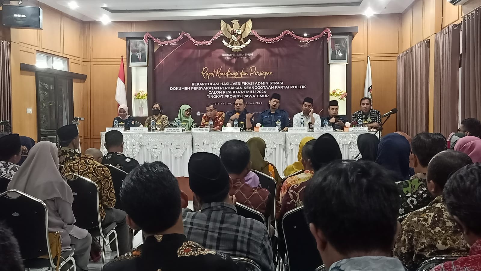 Banyuwangi, kab-banyuwangi.kpu.go.id, KPU Provinsi Jawa Timur menyelenggarakan Rapat Koordinasi dan Persiapan Rekapitulasi Hasil Verifikasi Administrasi Dokumen Persyaratan Perbaikan Keanggotaan Partai Politik Calon Peserta Pemilu 2024 Tingkat Provinsi Jawa Timur. Acara yang dibuka secara langsung oleh Ketua KPU Jatim Bapak Choirul Anam di Aula Kantor KPU Kota Madiun dihadiri oleh seluruh Anggota KPU Provinsi Jatim beserta Ibu Sekretaris dan Jajarannya. Peserta Rakor kali ini melibatkan 6 orang dari tiap Kab/Kota Se-Jawa Timur, yakni Ketua, Anggota KPU Kab/Kota Divisi Teknis Penyelenggaraan, Divisi Sosdiklih Parmas dan SDM, Sekretaris, Kasubag Tekmas serta Operator/Verifikator Sipol. Dalam sambutan pembukaan, Bapak Choirul Anam menyampaikan harapannya kepada KPU Kabupaten/Kota untuk mempersiapkan betul Verifikasi Faktual yang akan segera dilakukan dalam beberapa hari ke depan. "Tenaga verifikator yang sangat minim ini harus mampu di manage dengan baik agar pelaksanaan verifikasi faktual nantinya dapat efektif dan berjalan lancar", tegas Bapak Choirul Anam