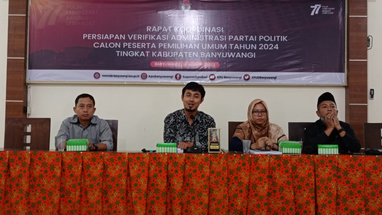 Banyuwangi, kab-banyuwangi.kpu.go.id – Hari ini merupakan hari dimulainya tahapan verifikasi administrasi di tingkat KPU Kabupaten terhadap partai politik yang berkas pendaftarannya telah dinyatakan lengkap dan telah diterbitkan Berita Acara oleh KPU RI. Sebelum tahapan verifikasi administrasi tingkat KPU Kabupaten, KPU Kabupaten Banyuwangi (16/8) mengadakan kegiatan Rapat Koordinasi Persiapan Verifikasi Administrasi bersama Bawaslu Kabupaten Banyuwangi, Polresta Banyuwangi dan Partai Politik Tingkat Kabupaten Banyuwangi. Rapat tersebut dimaksudkan agar Bawaslu Kabupaten Banyuwangi dan Partai Politik mengetahui dan mengerti apa saja yang akan dilakukan oleh KPU Kabupaten Banyuwangi dalam proses verifikasi administrasi. KPU Kabupaten Banyuwangi selain memberikan informasi terkait indikator-indikator keabsahan keanggotaan yang dinyatakan MS (Memenuhi Syarat), juga memberikan informasi terkait langkah-langkah apa yang harus dilakukan oleh Partai Politik untuk melakukan pembuktian keanggotaan Partai Politik yang berpotensi dinyatakan BMS (Belum Memenuhi Syarat). Dalam kesempatan tersebut ada beberapa pertanyaan dari partai politik, salah satunya yakni terkait LO Partai Politik Tingkat Kabupaten Banyuwangi yang tidak masuk dalam SIPOL (Sistem Informasi Partai Politik) karena tidak memiliki akses ke dalam aplikasi SIPOL. Menanggapi pertanyaan tersebut Ari Mustofa (Anggota KPU Kabupaten Banyuwangi Divisi Teknis Penyelenggaraan) menjelaskan bahwa terkait akses di SIPOL untuk Partai Politik tergantung dari DPP (atau sebutan lain di Tingkat Pusat) Partai Politik masing-masing, jadi untuk itu bisa di koordinasikan dan di komunikasikan kepada DPP Partai Politik masing-masing. Turut hadir dalam Rapat Koordinasi Persiapan Verifikasi Administrasi Partai Politik Calon Peserta Pemilihan Umum Tahun 2024, Dwi Anggraini Rahman (Ketua KPU Kab. Banyuwangi), Ari Mustofa (Anggota KPU Kab. Banyuwangi ), Eko Sumanto (Anggota KPU Kab. Banyuwangi), H.Hamim (Ketua Bawaslu Kab. Banyuwangi), Aksan Mustofa (Anggota Bawaslu Kab. Banyuwangi), Aiptu Gatot Soebroto (Kasubnit 1 Unit Politik Polresta Banyuwangi), LO di tingkat Kabupaten Banyuwangi Partai Politik yang berkas pendaftarannya telah dinyatakan lengkap.