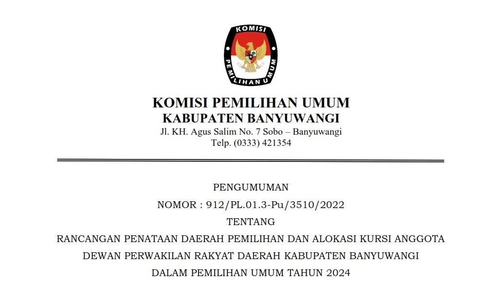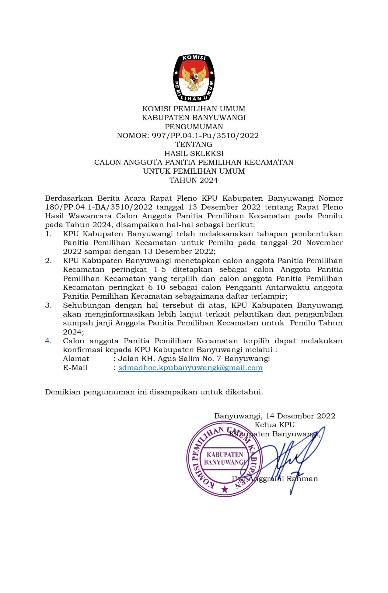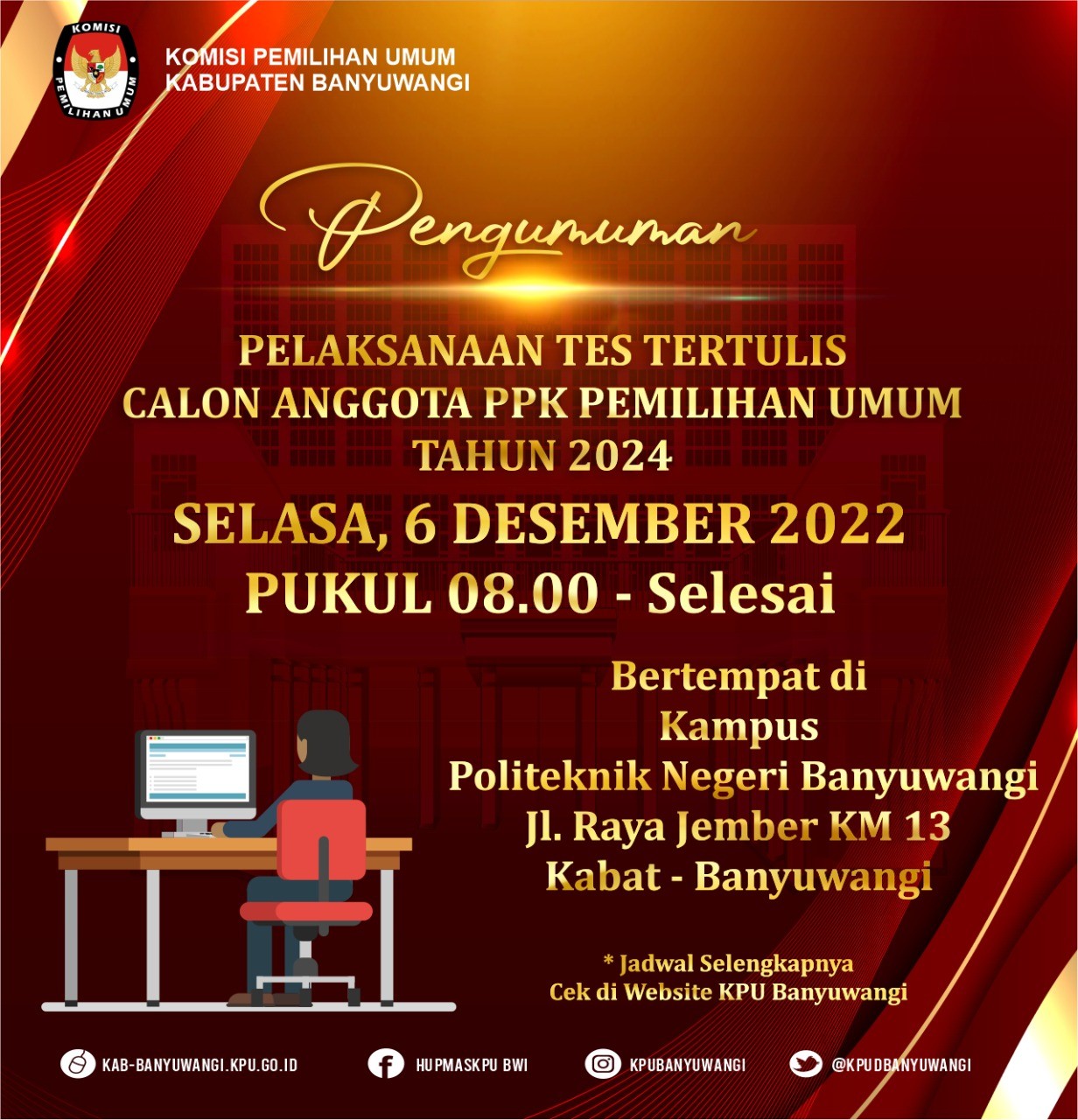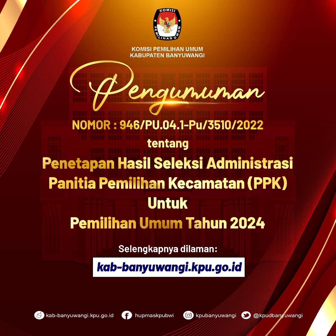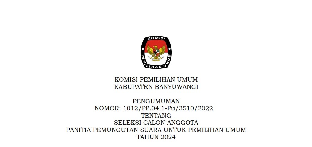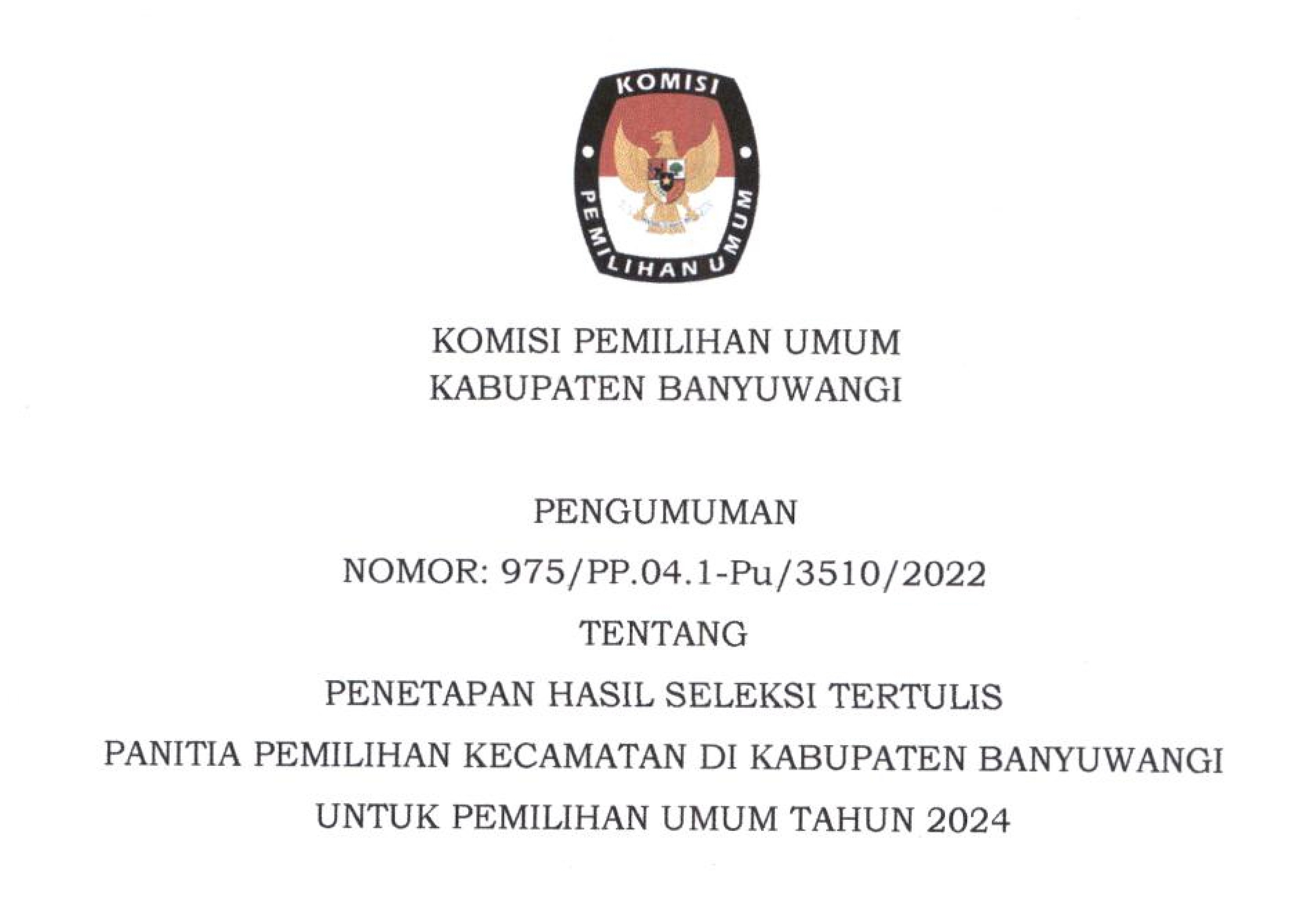 Banyuwangi, kab-banyuwangi.kpu.go.id - Berikut disampaikan Pengumuman Penetapan Hasil Seleksi Administrasi PPK Pemilu Tahun 2024. Selanjutnya bagi nama-nama yang dinyatakan LULUS seleksi administrasi calon anggota PPK untuk hadir dalam seleksi tertulis yang akan dilaksanakan pada :
