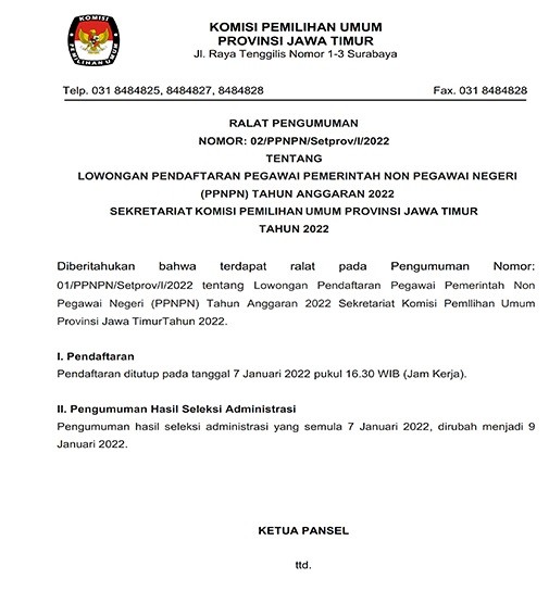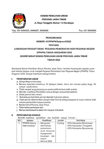 Banyuwangi - Pengumuman Lowongan Pendaftaran PPNPN TA 2022 SEKRETARIAT KPU PROVINSI JAWA TIMUR TAHUN 2022 Nomor 01/PPNPN/Setprov/I/2022 DIRALAT dengan Nomor 02/PPNPN/Setprov/I/2022