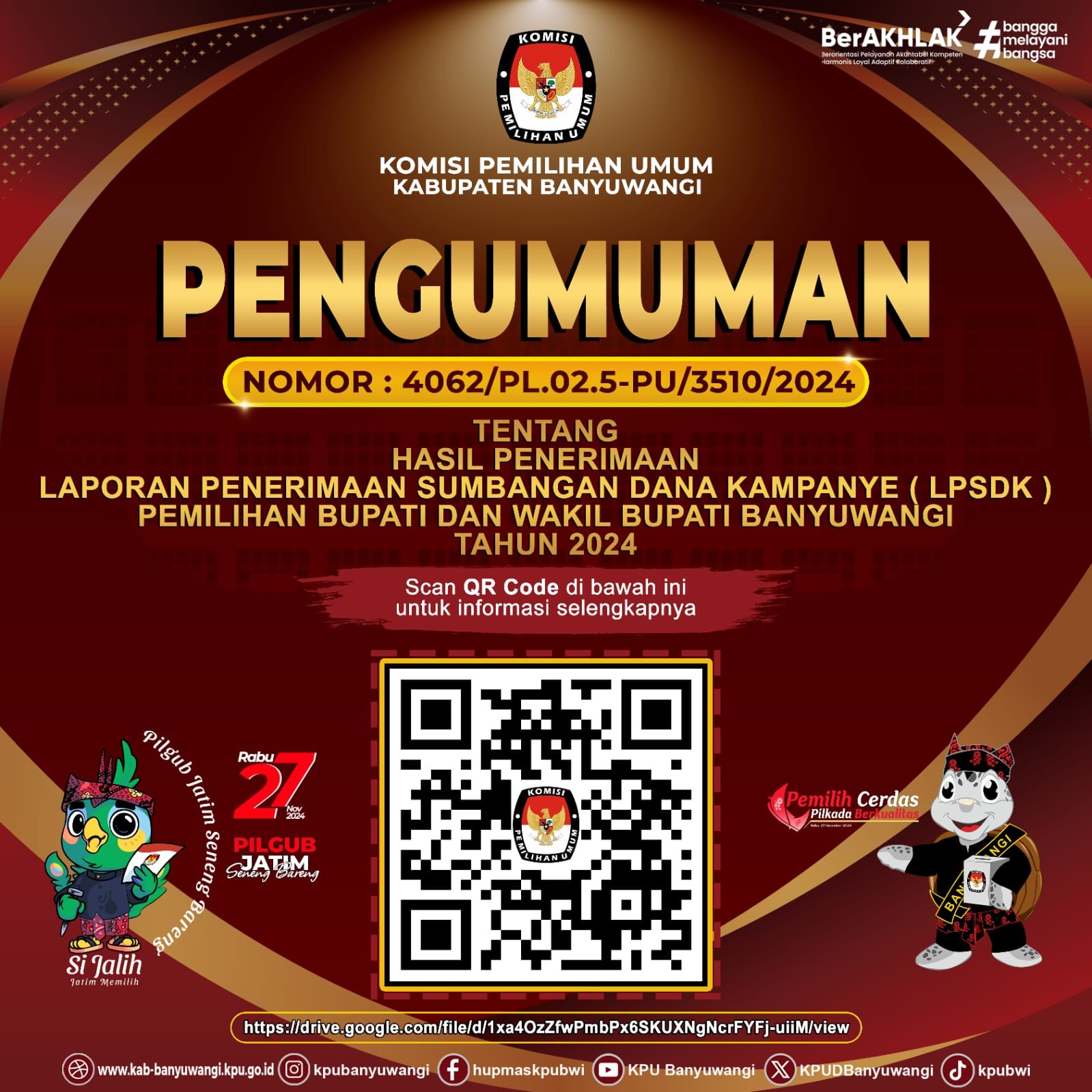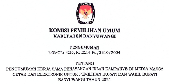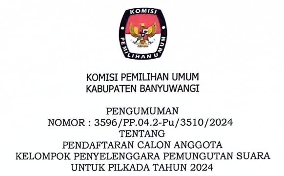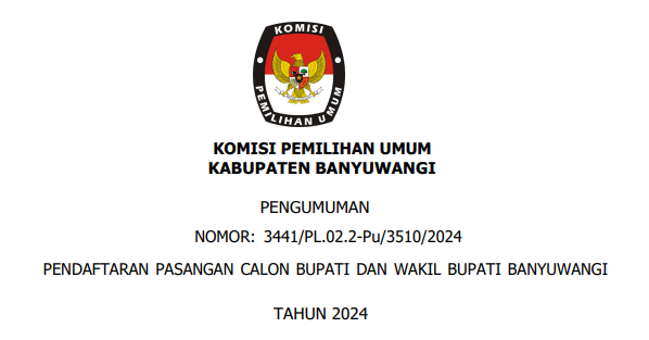 Banyuwangi, kab-banyuwangi.kpu.go.id - Berikut disampaikan Pengumuman KPU Kabupaten Banyuwangi tentang Hasil Penelitian Persyaratan Administrasi/Perbaikan Persyaratan Administrasi Calon, Visi,Misi, Program Bakal Pasangan Calon Bupati dan Wakil Bupati Banyuwangi Pemilihan Serentak Tahun 2024.