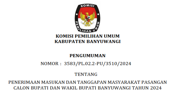 KPU Kabupaten Banyuwangi pada tanggal 15 - 18 September 2024 akan menerima masukan dan tanggapan masyarakat yang masuk baik melalui laman infopemilu.kpu.go.id maupun yang datang langsung ke Kantor KPU Kabupaten Banyuwangi.