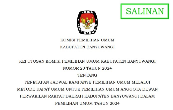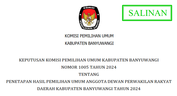 Banyuwangi, kab-banyuwangi.kpu.go.id - Berikut diumumkan Keputusan Komisi Pemilihan Umum Kabupaten Banyuwangi Nomor 1005 Tahun 2024 tentang Penetapan Hasil Pemilihan Umum Anggota DPRD Kabupaten Banyuwangi Tahun 2024.