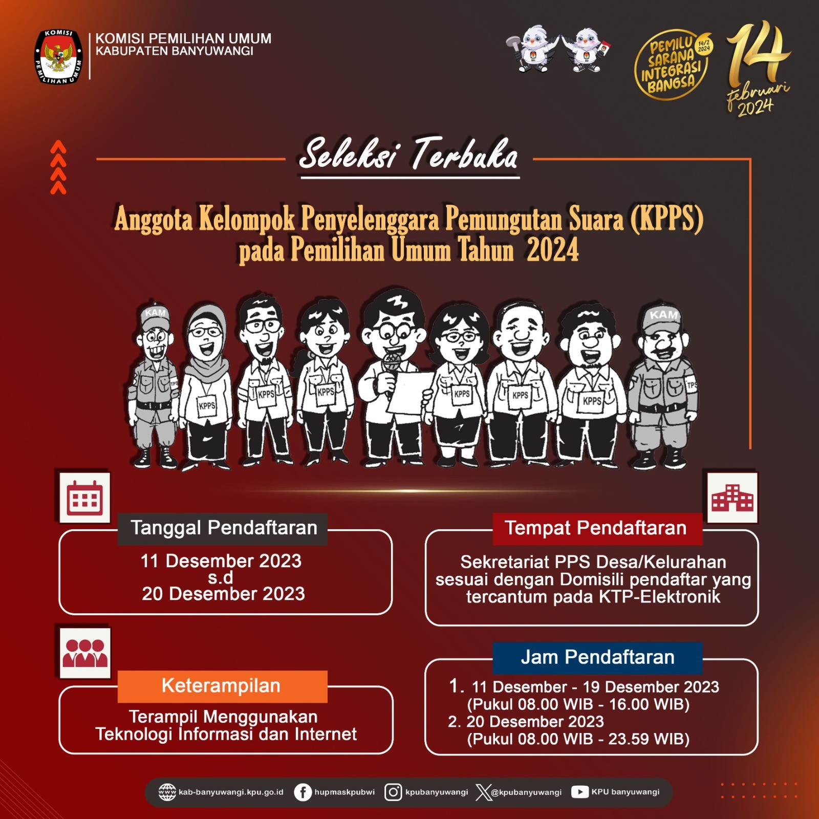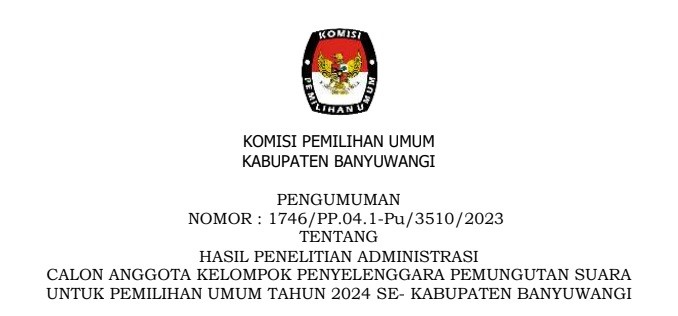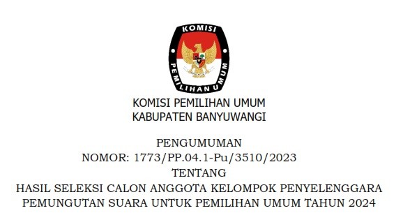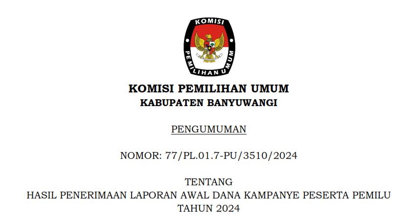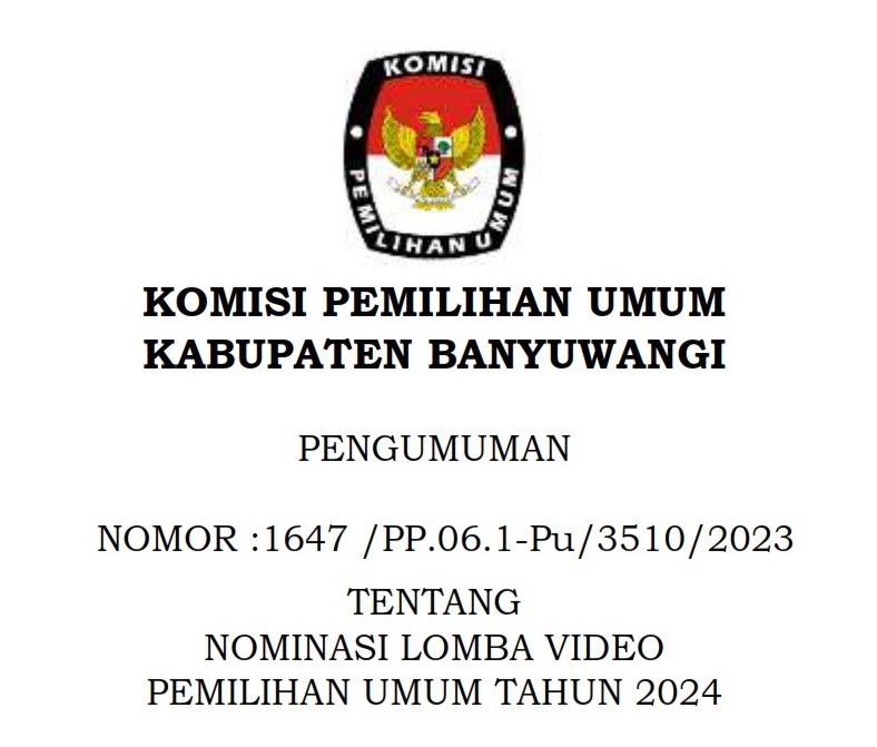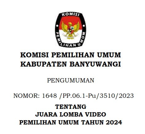 Banyuwangi, kab-banyuwangi.kpu.go.id - KPU Kabupaten Banyuwangi mengumumkan 3 (tiga) nama yang masuk Nominasi Lomba Video Pemilihan Umum Tahun 2024. Selanjutnya KPU Kabupaten Banyuwangi mengundang nama yang masuk nominasi untuk hadir dalam acara Pengumuman Juara dan Penyerahan Hadiah Lomba Video Pemilu 2024, yang akan dilaksanakan pada :