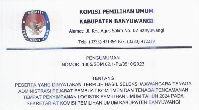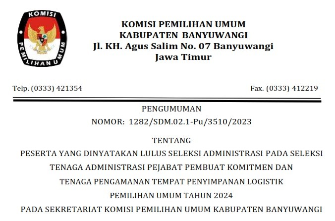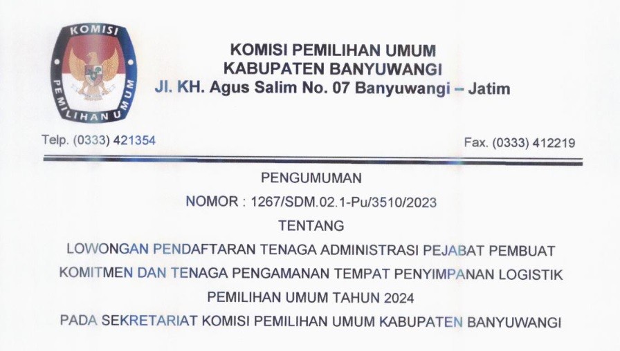 Banyuwangi, kab-banyuwangi.kpu.go.id - Berikut disampaikan Pengumuman KPU Kabupaten Banyuwangi Nomor 1267/SDM.02.1-Pu/3510/2023 tentang Lowongan Pendaftaran Tenaga Administrasi Pejabat Pembuat Komitmen dan Tenaga Pengamanan Tempat Penyimpanan Logistik Pemilihan Umum Tahun 2024 pada Sekretariat KPU Kabupaten Banyuwangi.