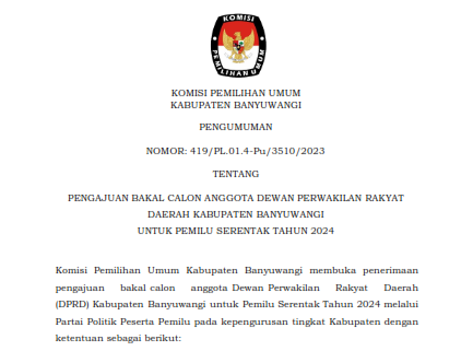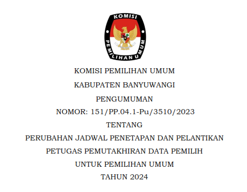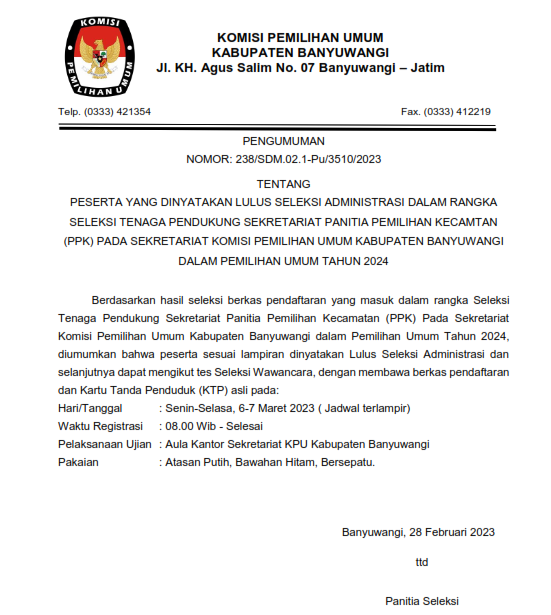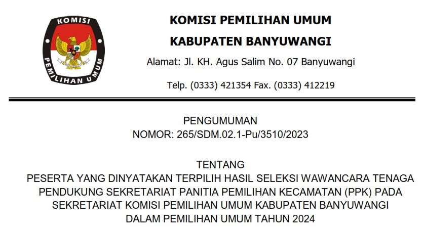 Banyuwangi - kab-banyuwangi.kpu.go.id, Berikut disampaikan pengumuman tentang peserta yang dinyatakan terpilih hasil seleksi wawancara tenaga pendukung sekretariat PPK pada sekretariat KPU Kabupaten Banyuwangi dalam Pemilu 2024.
