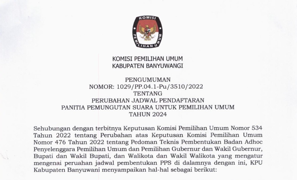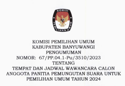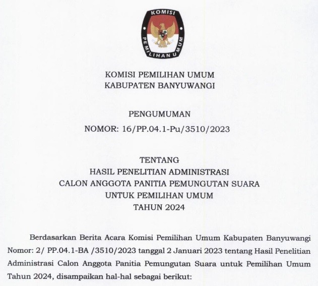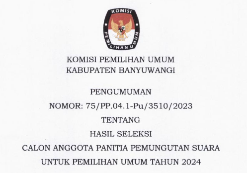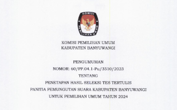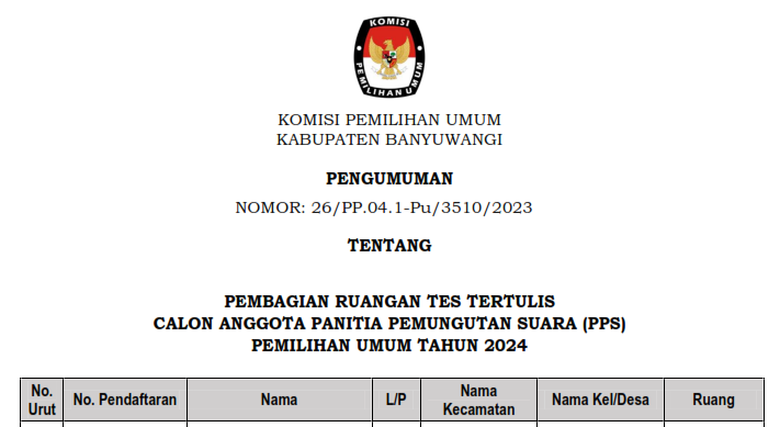 Banyuwangi, kab-banyuwangi.kpu.go.id – Berikut disampaikan Pengumuman Pembagian Ruangan Tes Tertulis PPS Pemilu Tahun 2024.